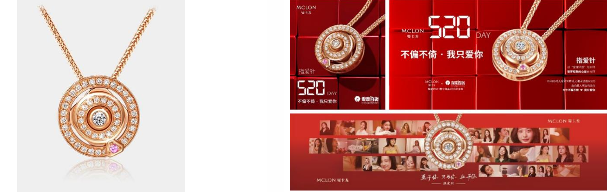 2022年,单款“爆款”产品指爱针在抖音平台达9亿+话题曝光, 互动 1000 万+,产品抖音单支视频达280 万赞,7000万播放,并且在“520”、七夕期间,指爱针项链在天猫、京东的单品销售榜均为第一。