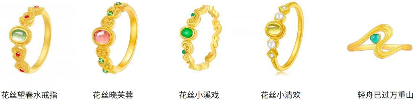 公司深耕黄金戒指细分类目,产品设计精美的同时,推新速度较快,在细分赛道做出差异化竞争优势。时尚珠宝产品系列持续迭代、东方时尚与现代审美主题不断推新。东方时尚主题的娇玉系列中的玲珑小娇玉戒指将清透温润的芙蓉石与葫芦结合,玲珑小紫葫戒指以清·粉彩大吉葫芦壁瓶为灵感来源,寓意福禄双收;蝴蝶系列采用高温珐琅工艺等,推出冰澜玉蝶、烟雨梦蝶等产品;现代审美主题的恋恋风情彰显贵气千金风、辛德瑞拉产品系列主打童话公主风、傲慢与偏见表达个性主义;DIY串珠系列如中药养生系列、松软蛋糕坊系列、软心水果糖系列等获较多年轻群体青睐。