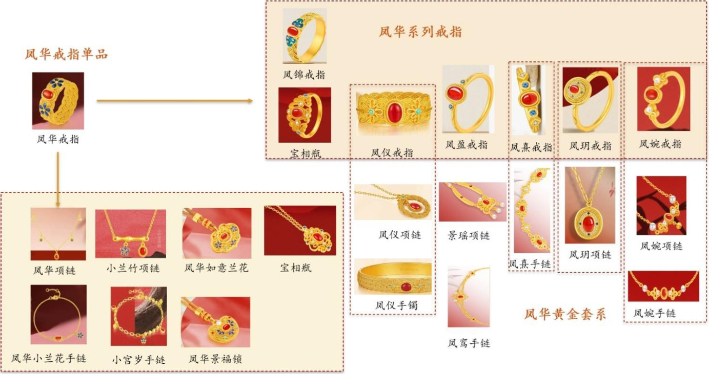 凤华系列为克重类计价产品,有纯黄金、黄金镶嵌宝石、黄金镶嵌钻石、K金镶嵌钻石产品,其毛利率水平较素金产品更高。凤华经历了从大单品到凤华产品系列再到凤华子品牌的过程,从戒指到项链、吊坠,延伸出凤华系列黄金套件(包括小兰花手链、凤华项链)以及后续衍生的凤盈、凤熹、凤玥、凤仪等系列产品。