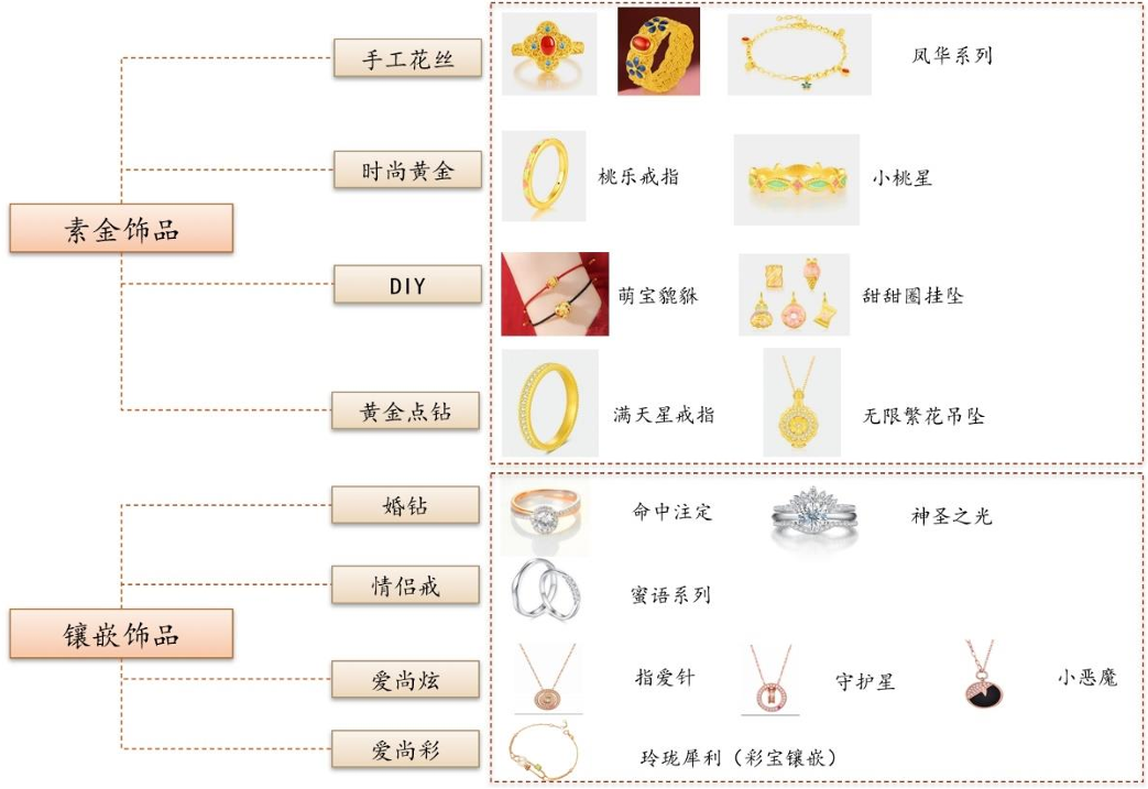 公司的四大核心黄金品类为手工花丝、时尚黄金、DIY和黄金点钻,公司高度重视产品的原创态度和时尚设计,明星主题系列有凤华系列、黄金戒指系列、洛神珠系列、慕璨系列、恋恋风情系列等产品,覆盖东方时尚和国际轻奢两大赛道。