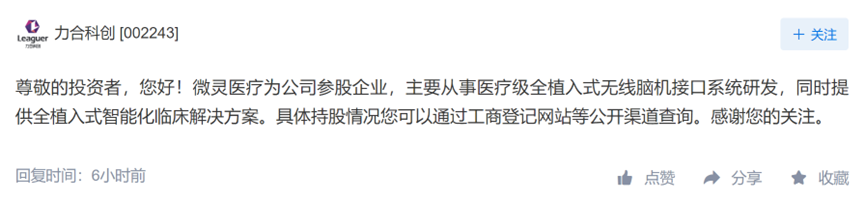 力合科创披露,公司参股企业微灵医疗主要从事医疗级全植入式无线脑机接口系统研发,同时提供全植入式智能化临床解决方案。