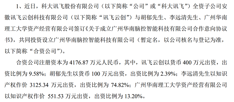 科大讯飞于2019年2月披露对外投资,公司全资子公司讯飞云创与胡郁、李远清等共同投资设立广州华南脑控智能科技有限公司。李远清是华南理工大学自动化科学与工程学院院长、“脑机接口与脑信息处理研究中心”主任。公司还与同济大学、北京师范大学等开展相关合作,在上海成立科大讯飞(上海)人工智能及脑科学研究院。