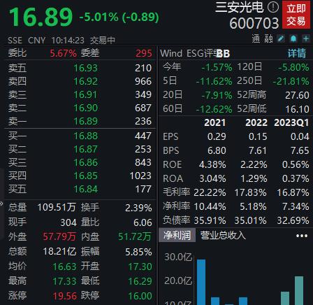 6月13日,三安光电盘中快速跳水,一度跌超8%。截至发稿,该股跌幅收窄至5%,报16.89元,成交额超18亿元环比显著放大。此前3个交易日已累跌12%。