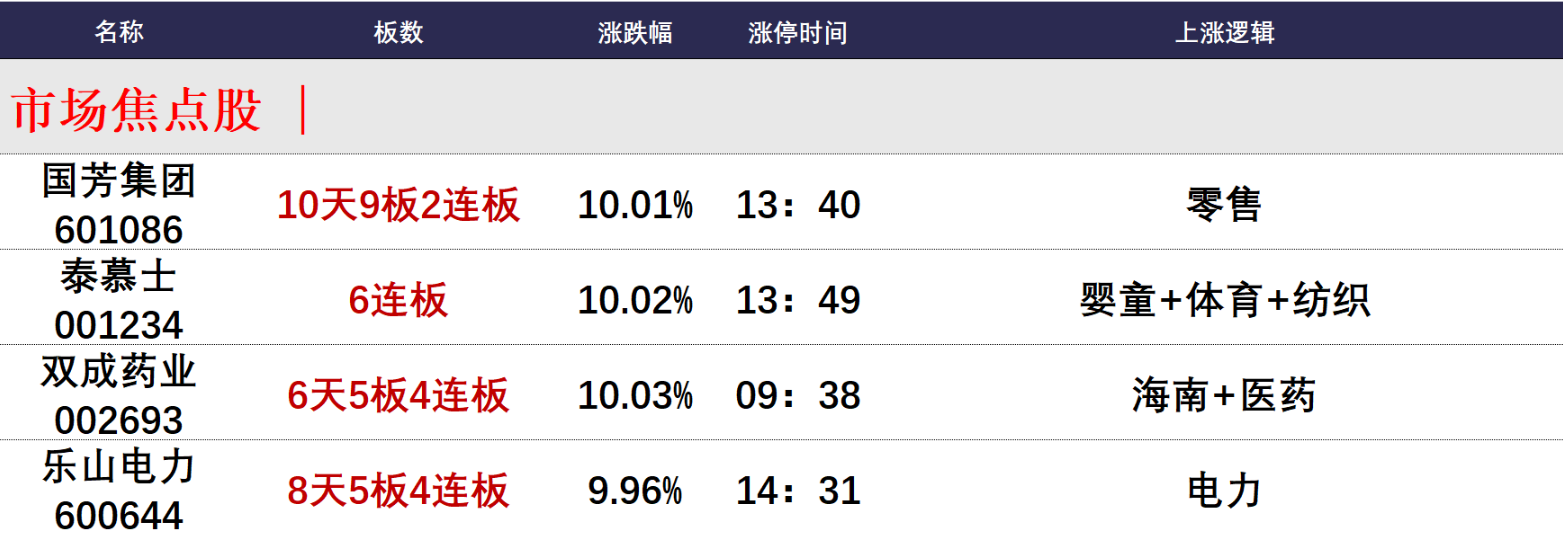 今日共86股涨停,连板股总数20只,23股封板未遂,封板率为79%(不含ST股、退市股)。焦点股方面,大消费板块国芳集团10天9板,泰慕士6连板,海南本地股双成药业6天5板,电力股乐山电力8天5板。