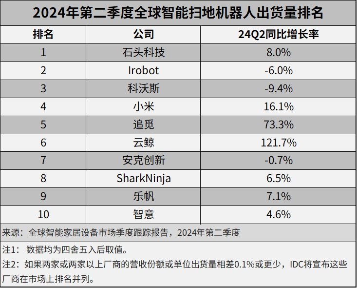 2024年第二季度,全球智能扫地机器人头部厂商表现如下: