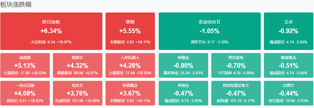 板块方面,机器人、钢铁、固态电池、电机等板块涨幅居前,机场、农业、白酒、影视等板块跌幅居前。截至收盘,沪指涨0.5%,深成指涨0.24%,创业板指涨0.26%。