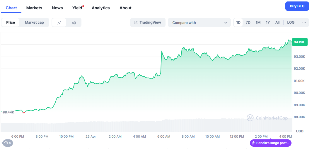特朗普口风放缓引发加密全线大涨!比特币价格重回94000美元