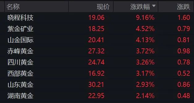 黄金股早间大幅高开高走,板块指数放量大涨逾2%,半日成交超昨日全天成交。板块内所有个股飘红,晓程科技、山金国际、赤峰黄金、山东黄金等涨幅居前。