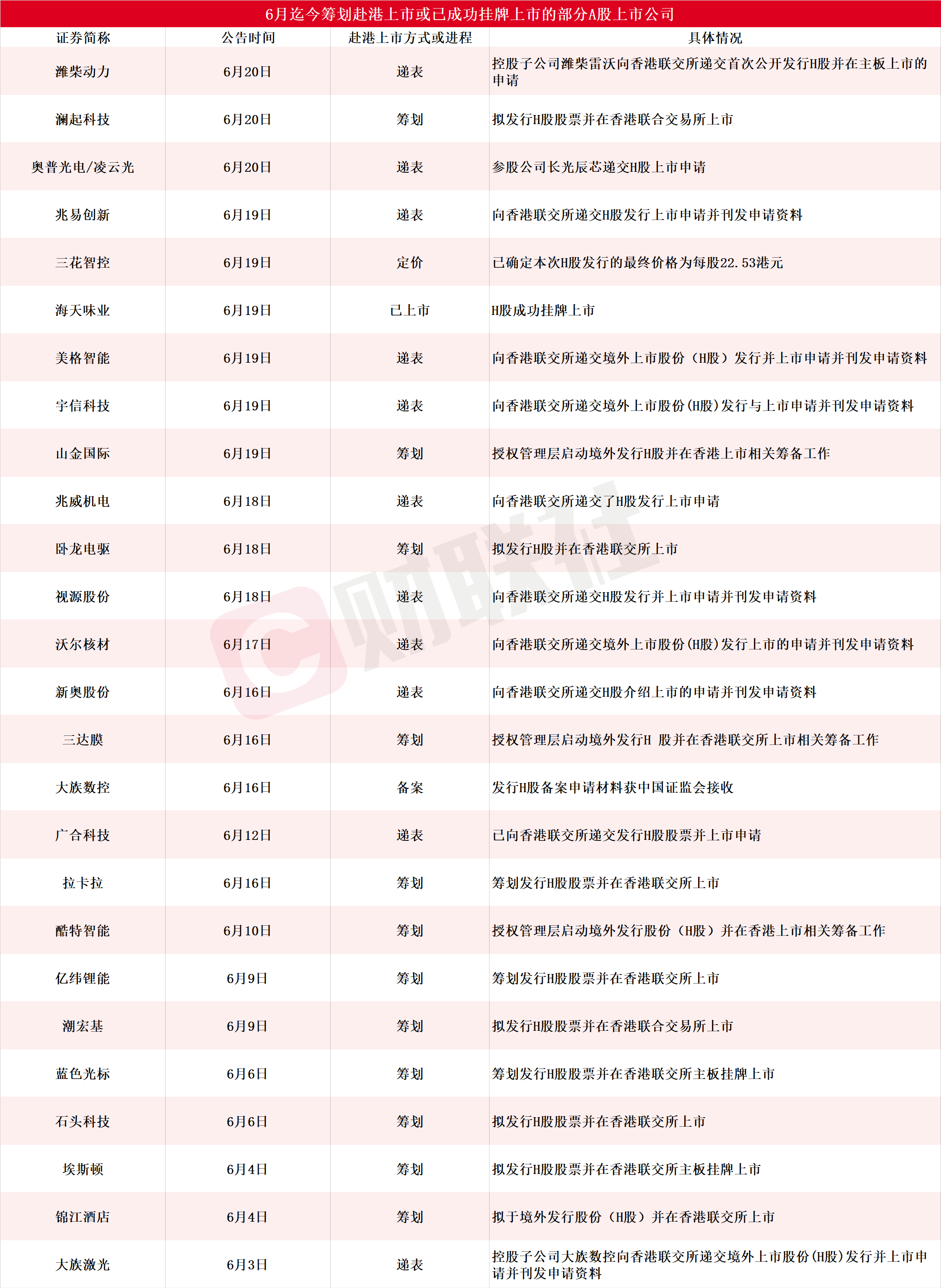 近期,众多A股公司排队申请赴港上市。据不完全统计,截至发稿,6月迄今包括潍柴动力、澜起科技、奥普光电、凌云光、兆易创新、三花智控、海天味业、美格智能、宇信科技、山金国际、兆威机电、卧龙电驱、视源股份、沃尔核材、新奥股份、三达膜、大族数控、广合科技、拉卡拉、酷特智能、亿纬锂能、潮宏基、蓝色光标、石头科技、埃斯顿、锦江酒店、大族激光在内的27家A股上市公司披露筹划公司或分拆子公司赴港上市以及已向港交所递表的进展情况,详细情况见下图: