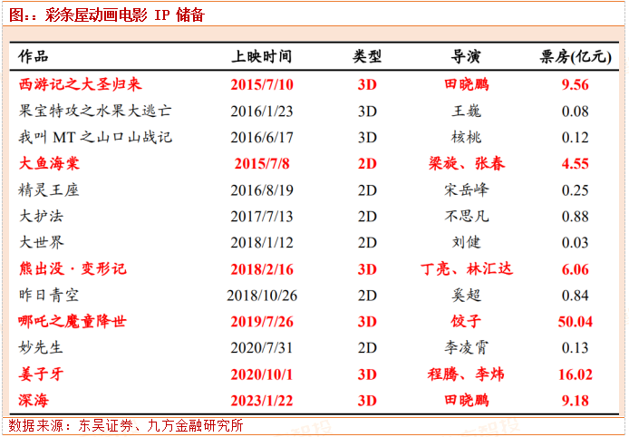 公司优势在于:1)布局前瞻,2015 年开始以动画电影作为核心战略业务,2)发行制作上具备优势,电影发行起家,宣发能力强;以彩条屋(在和被投资动画的公司进行合作)和光线动画(开发“中国神话宇宙”体系,并且“组建内部的动画制作团队”)两条线共同推进。 3)手握多个 IP,包括《哪吒》、《姜子牙》、《深海》等。