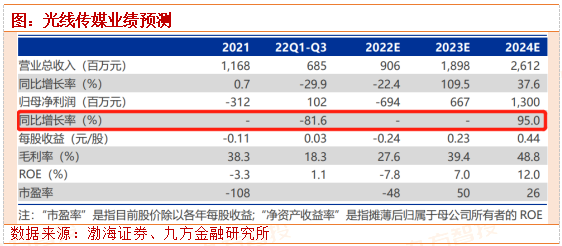 考虑到公司 23 年仍处于业务恢复和产能储备期,但动画电影项目储备丰厚,有望在 24-25 年带来集中释放,以 24 年 PE 评估目标估值;行业可比公司平均 PE 46 倍(根据 wind 一致预期,中文在线/芒果超媒/华策影视24年 PE 86/25/26倍,中文在线基于 IP 逻辑因此 PE 更高),而光线传媒拥有丰富的 IP 储备,估值因高于一般影视制作公司;光线历史 PE band 区间大多在【21,50】,考虑到明后年重回强劲增长、IP 的丰富储备,以及 AI 有望提振动画电影产能,并提升 IP 价值,有券商给予公司 24 年 36 倍 PE,目标市值 468 亿。