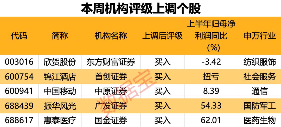 本周机构合计上调5股评级;锦江酒店上半年扭亏为盈,首创证券上调其评级至“买入”。