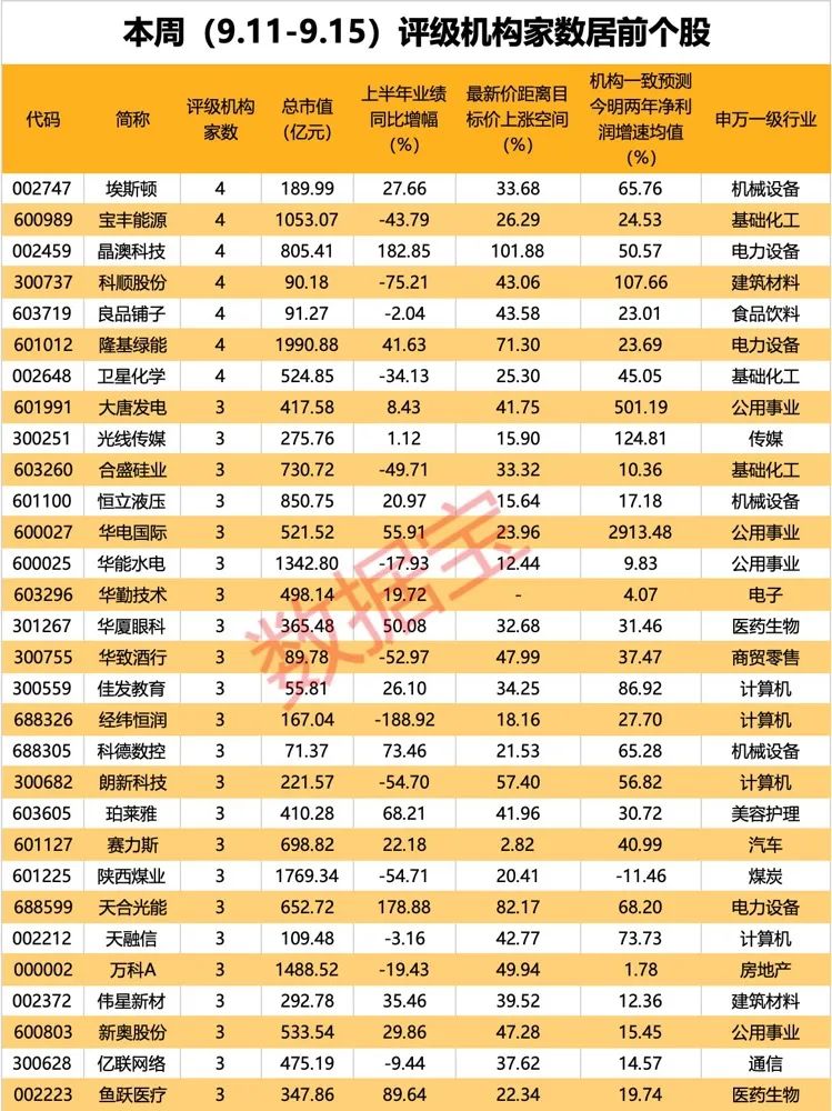 本周(9月11日至9月15日),61家机构合计进行769次评级,59家上市公司获“买入型”评级(包括买入、增持、强烈推荐、推荐)。