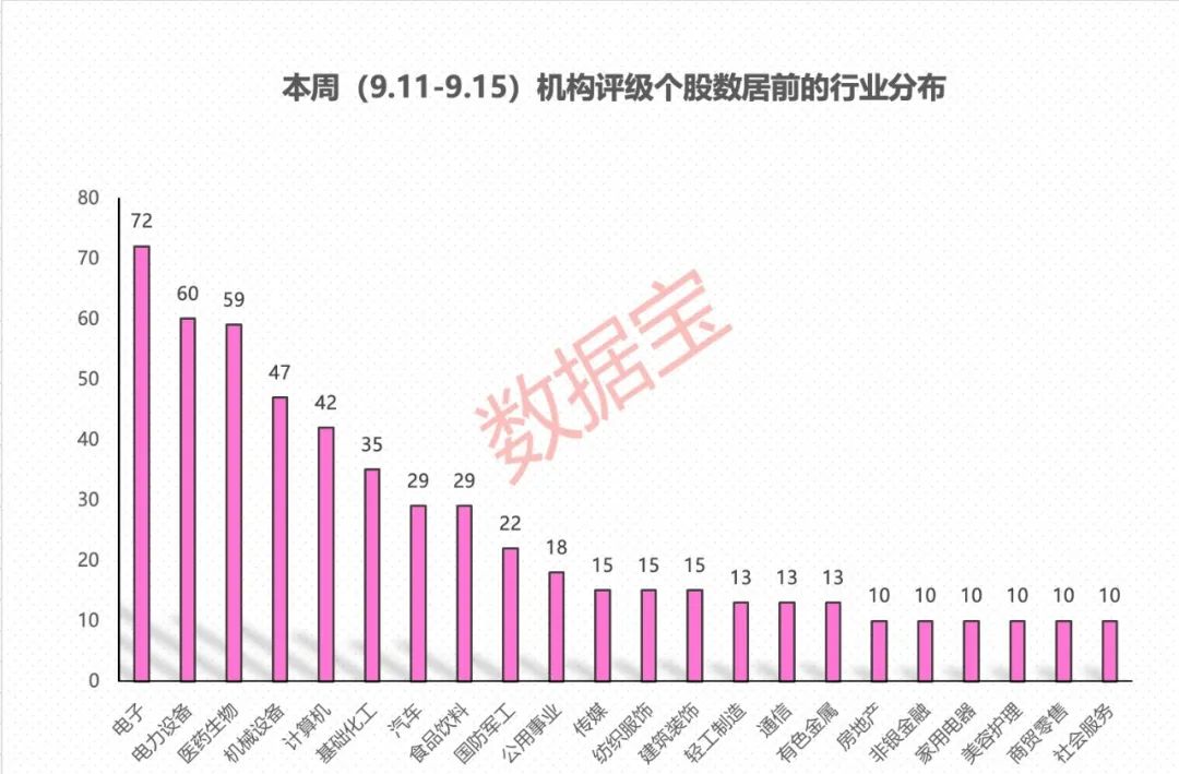 从申万一级行业来看,电子行业有72股获评级,位居首位;电力设备有60股,次之;医药生物有59股上榜,排名第三。