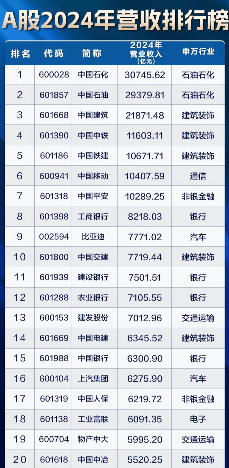 2024年,营业收入50强上市公司实现总营收31.54万亿元,与2023年(追溯调整后)的31.85万亿元基本持平。