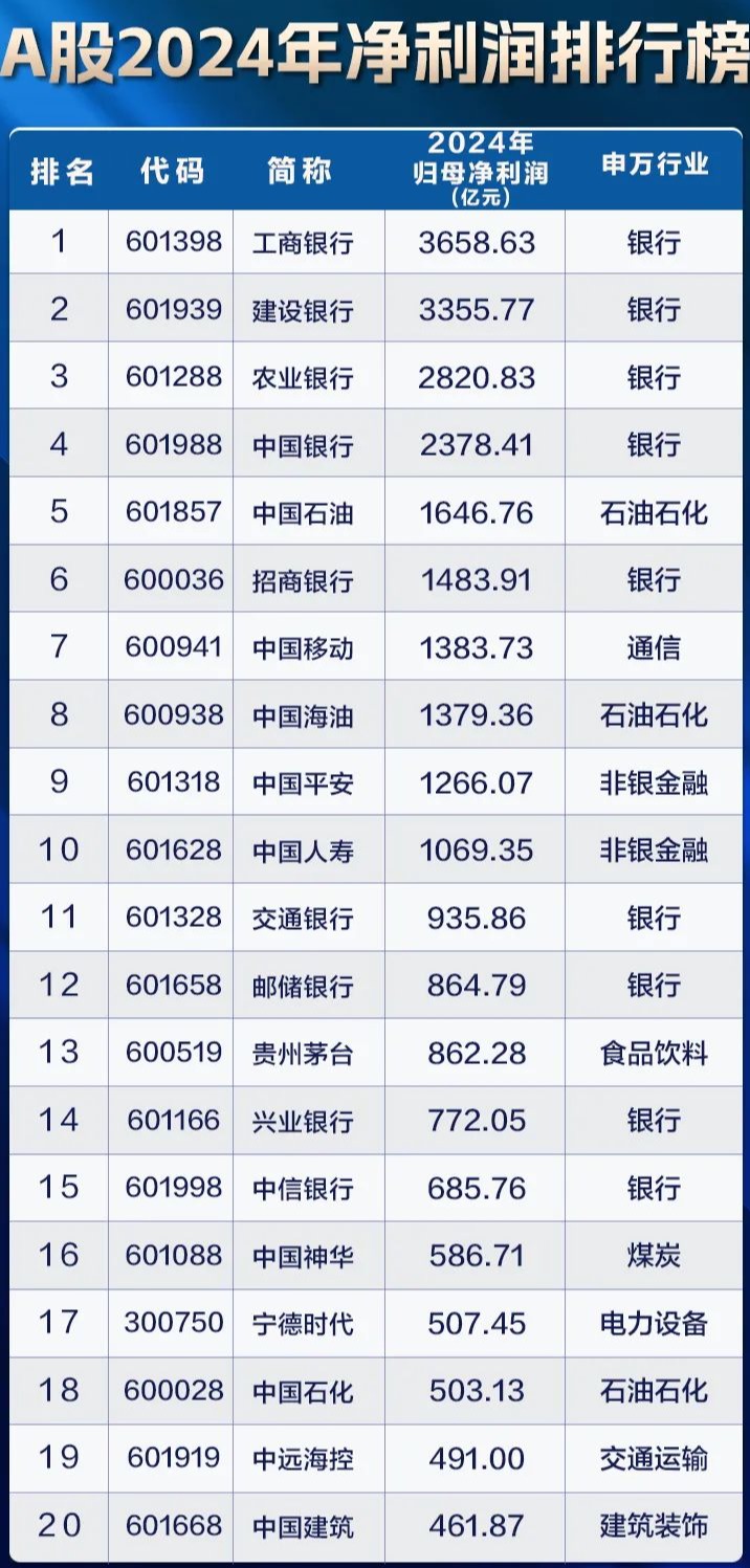A股业绩50强出炉!净利润“千亿俱乐部”首达10家
