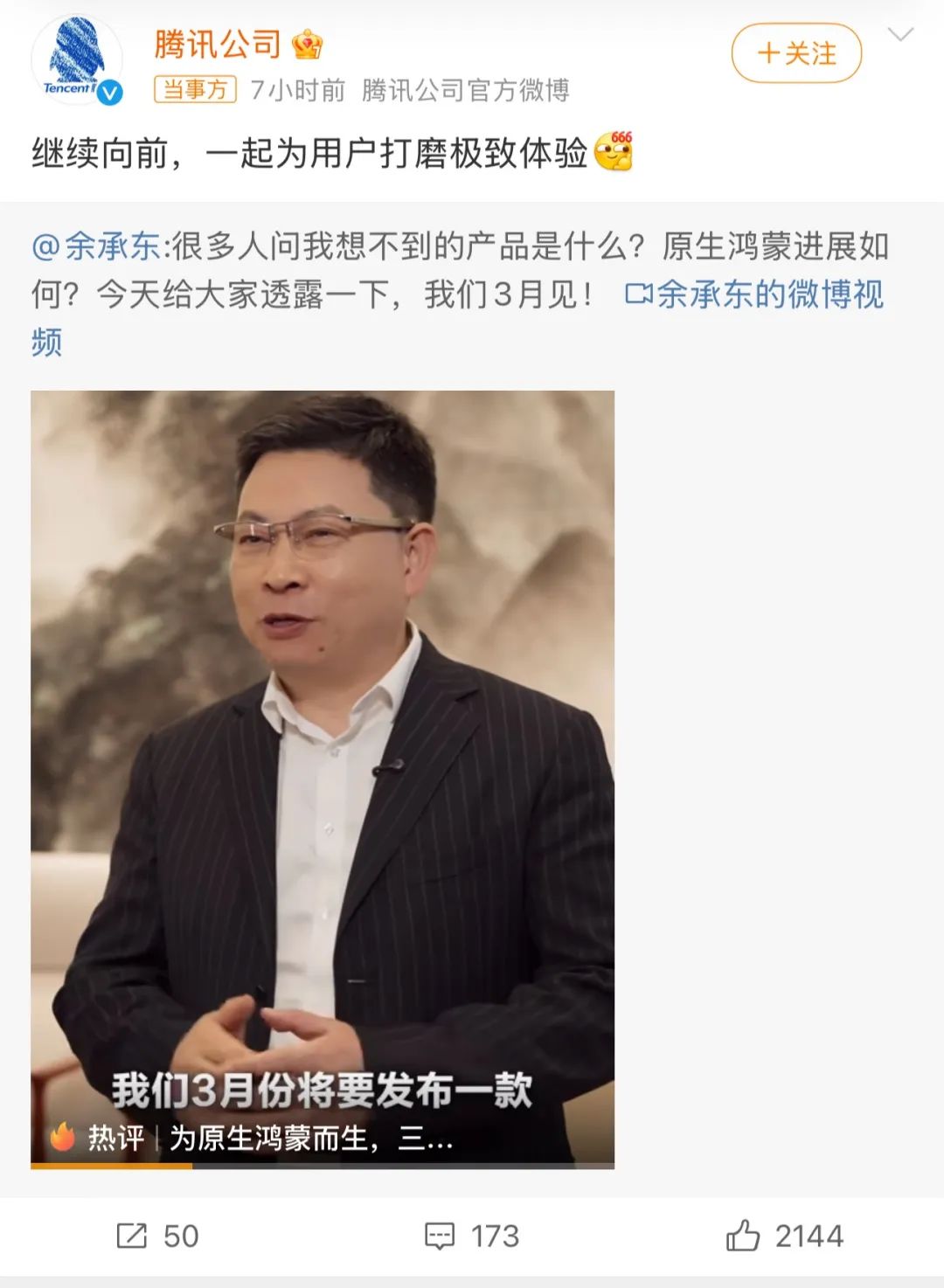 余承东曝3月将推“想不到的产品”,腾讯隔空回应!