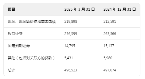 截至 2025 年 3 月 31 日,我们的保险和其他业务持有现金、现金等价物和美国国债(扣除未结算购买应付款后)3280 亿美元。权益和固定到期证券投资(不包括权益法投资)为 2788 亿美元。