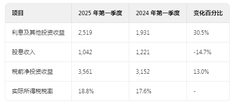 2025 年第一季度,股息收入较 2024 年减少 1.79 亿美元(14.7%)。下降的主要原因是权益证券的净处置,但部分被某些持仓股息率的提高所抵消。股息收入也会因投资组合的变化以及某些被投资公司股息的频率和时间而在不同期间有所不同。