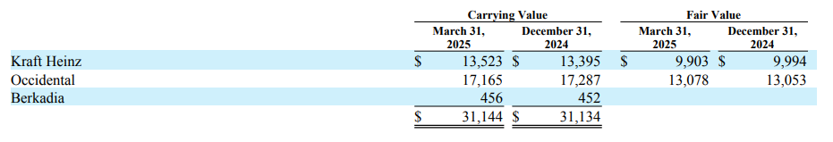 西方石油优先股按年利率 8% 累积股息,自 2029 年起西方石油可选择按清算价值 105% 的赎回价格赎回 。截至 2025 年 3 月 31 日,我们持有的西方石油优先股总清算价值约为 85 亿美元 。迄今为止,因西方石油向普通股股东分配股息超过规定金额(按优先股证书定义),已要求其赎回约 15 亿美元的优先股总清算价值。