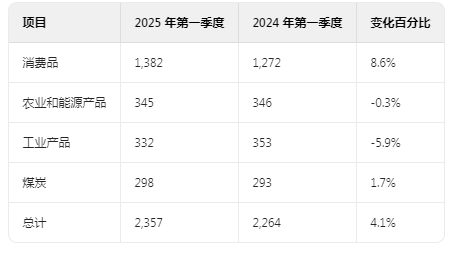 2025 年第一季度,消费品运营收入为 20 亿美元,较 2024 年增长 3.2%,反映了运输量增加 8.6%,但部分被每辆车 / 单位平均收入下降所抵消。运输量增加主要是由于西海岸进口增加导致的多式联运货物运输量增加,以及汽车产量提高带来的汽车运输量增加。