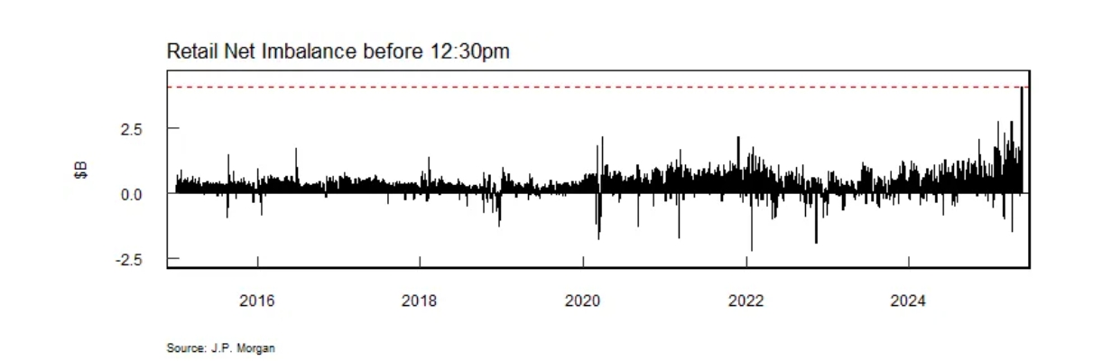 根据摩根大通量化团队汇编的数据,截至纽约时间周一正午12点30分,个人投资者净买入41亿美元美国股票,创下该时段历史最高纪录,也是首次在正午前突破40亿美元大关。数据也显示,散户们周一的交易量占比高达36%,超越四月下旬水平创出历史新高。