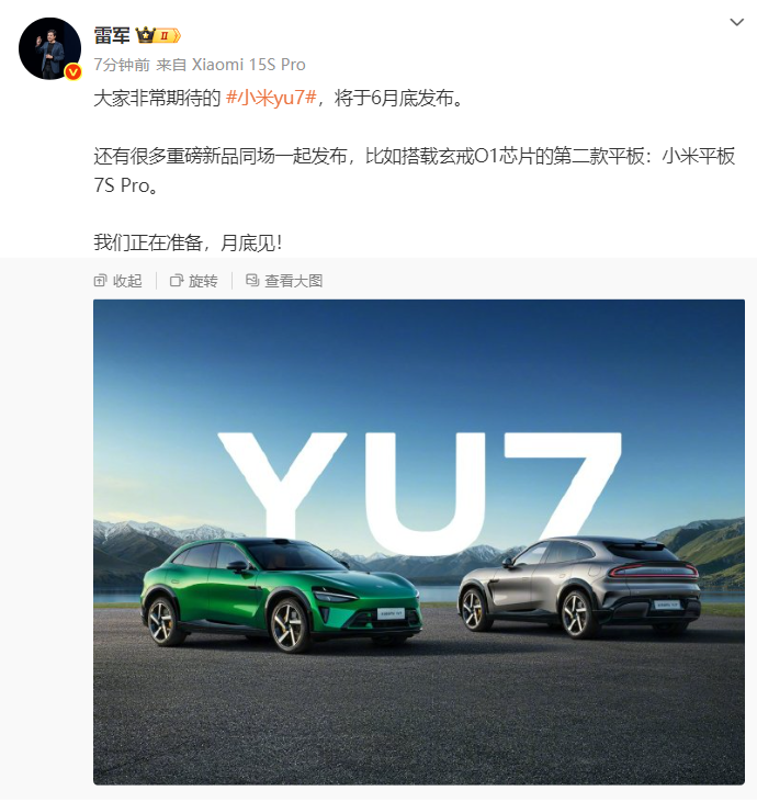 雷军今日在微博发文表示,小米YU7将于6月底发布,还有很多重磅新品同场一起发布,比如搭载玄戒O1芯片的第二款平板:小米平板7S Pro。