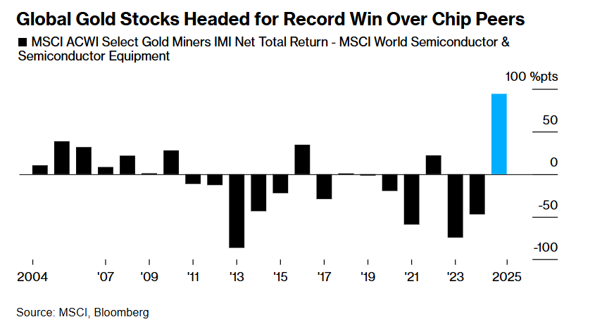 在今年,全球黄金股有望创纪录地大幅跑赢芯片股