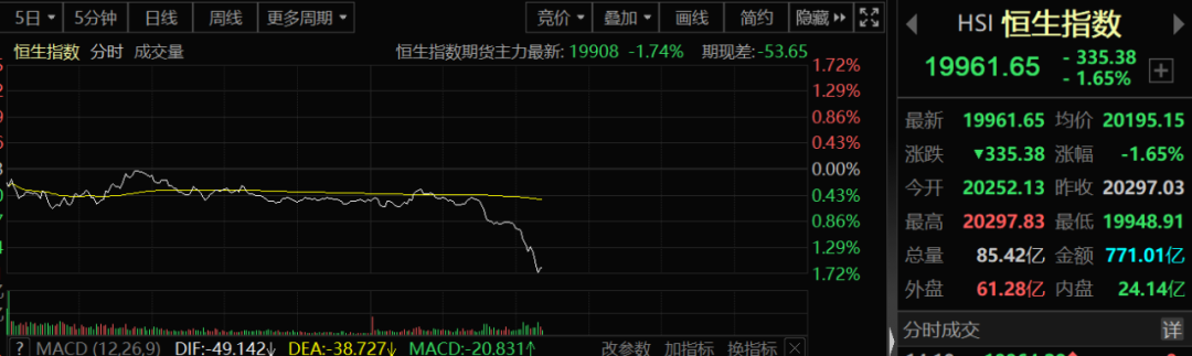 港股市场亦跟随杀跌。恒生指数和国企指数跌幅快速扩大至1.5%以上,恒生科技指数跌幅则扩大至2%以上。