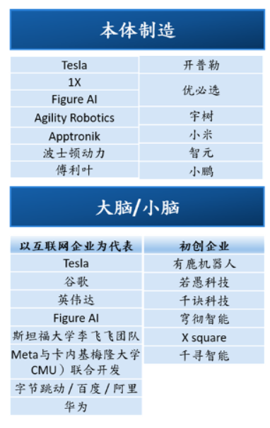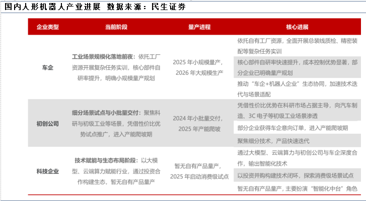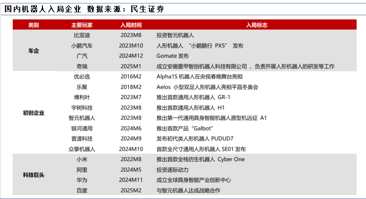 目前国内入局人型机器人领域的玩家主要有车企、初创企业、科技巨头三类, 三类企业各具优劣势。
