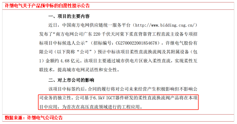 事件3:许继电气发布预中标公告,公司基于6.5kVIGCT器件研发的柔性直流换流阀产品将在南方电网公司广东220千伏天河棠下柔直背靠背工程项目中应用,该项目主要通过城市供电片区嵌入柔性直流,实现柔性互联技术,提高城市电网灵活性和安全性。