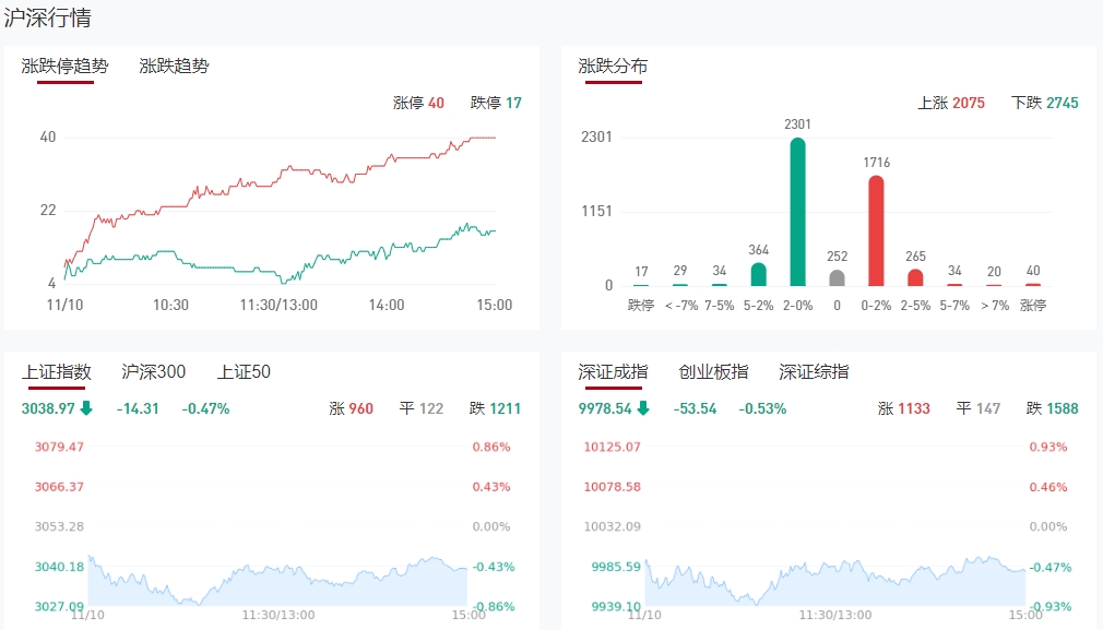 11月10日,大盘全天震荡调整,三大指数均小幅下跌。截至收盘,沪指跌0.47%,深成指跌0.53%,创业板指跌0.65%。总体上个股跌多涨少,两市超2700只个股下跌。沪深两市今日成交额8274亿,较上个交易日缩量1351亿。