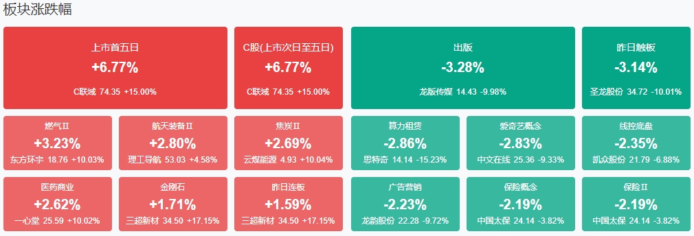 盘面上,燃气股集体走强,东方环宇、德龙汇能涨停。医药商业概念股震荡走强,一心堂涨停。存储芯片概念股开盘冲高,力源信息、好上好涨停。煤炭、电力股尾盘异动,云煤能源涨停。下跌方面,算力概念股展开调整,思特奇跌超10%,真视通跌停。此外高位股继续大跌,海立股份、天普股份盘中均上演“天地板”。板块方面,燃气、医药商业、煤炭、存储芯片等板块涨幅居前,算力、BC电池、传媒、鸿蒙概念等板块跌幅居前。