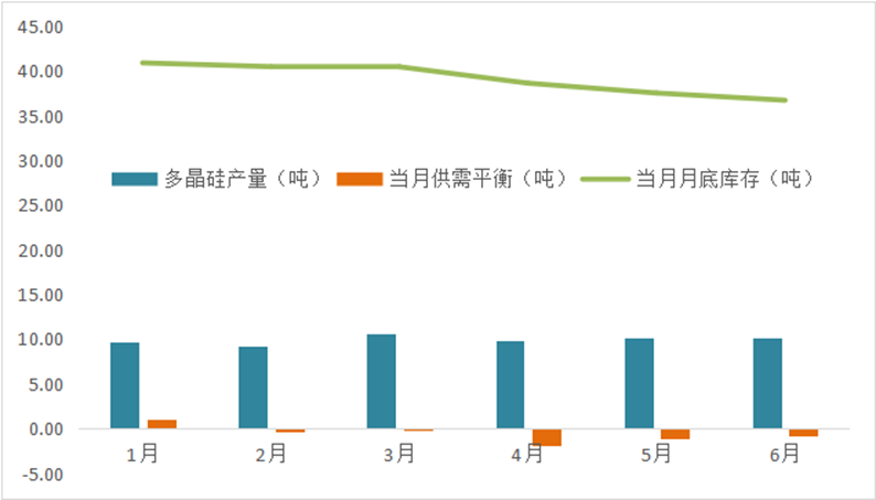 4-6月份“下行阶段”:抢装备货基本接近尾声,下游排产逐步减少,同期多晶硅产出小幅波动增加,虽仍维持去库状态,但去库量有所减少,再加之较大的行业库存基数暂无明显撼动,导致多晶硅价格再度进入下跌走势。