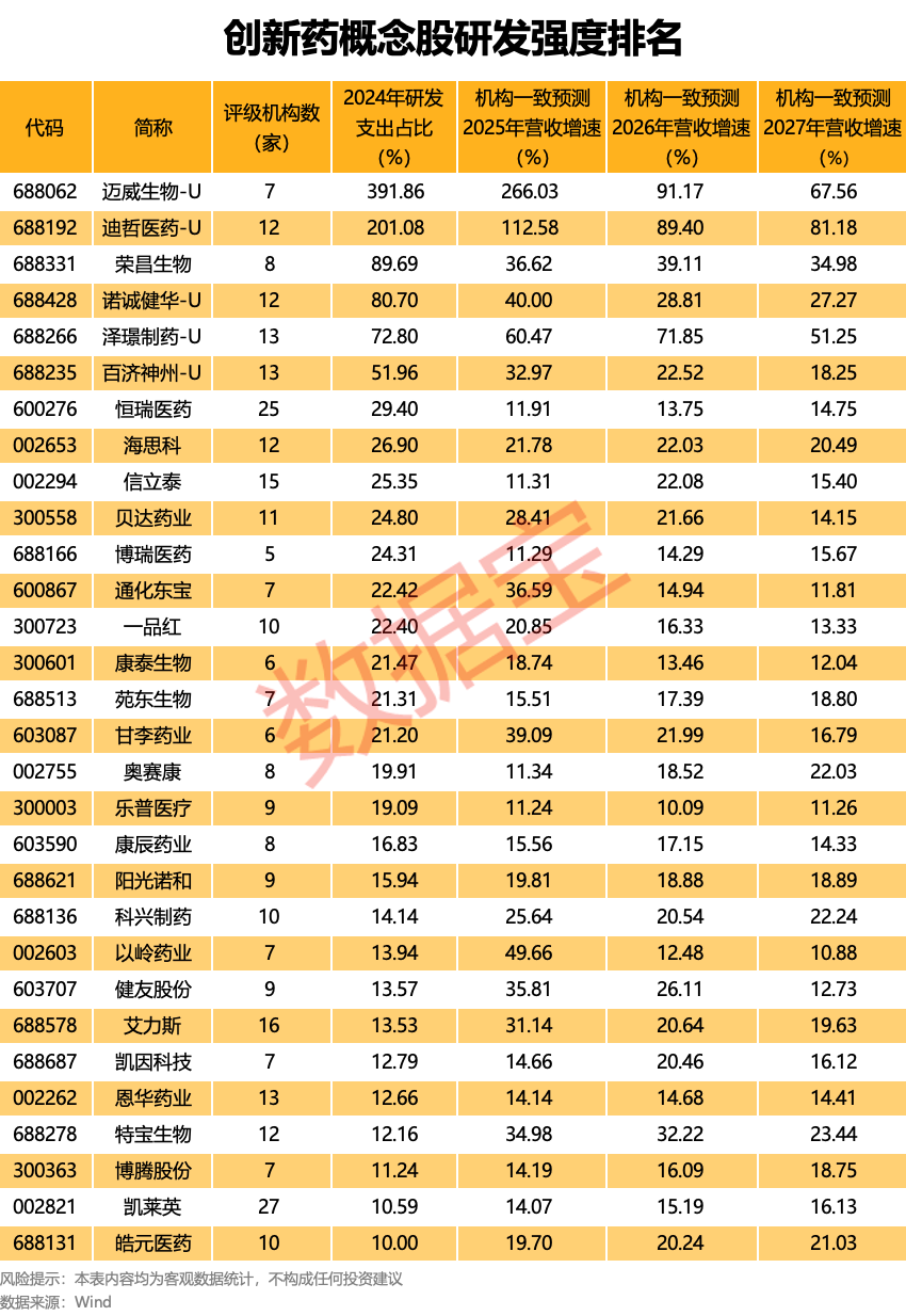 在5家及以上机构评级的创新药概念股中,有30股2024年研发支出占比超10%且机构一致预测今年、明年及2027年营收增速均超10%。