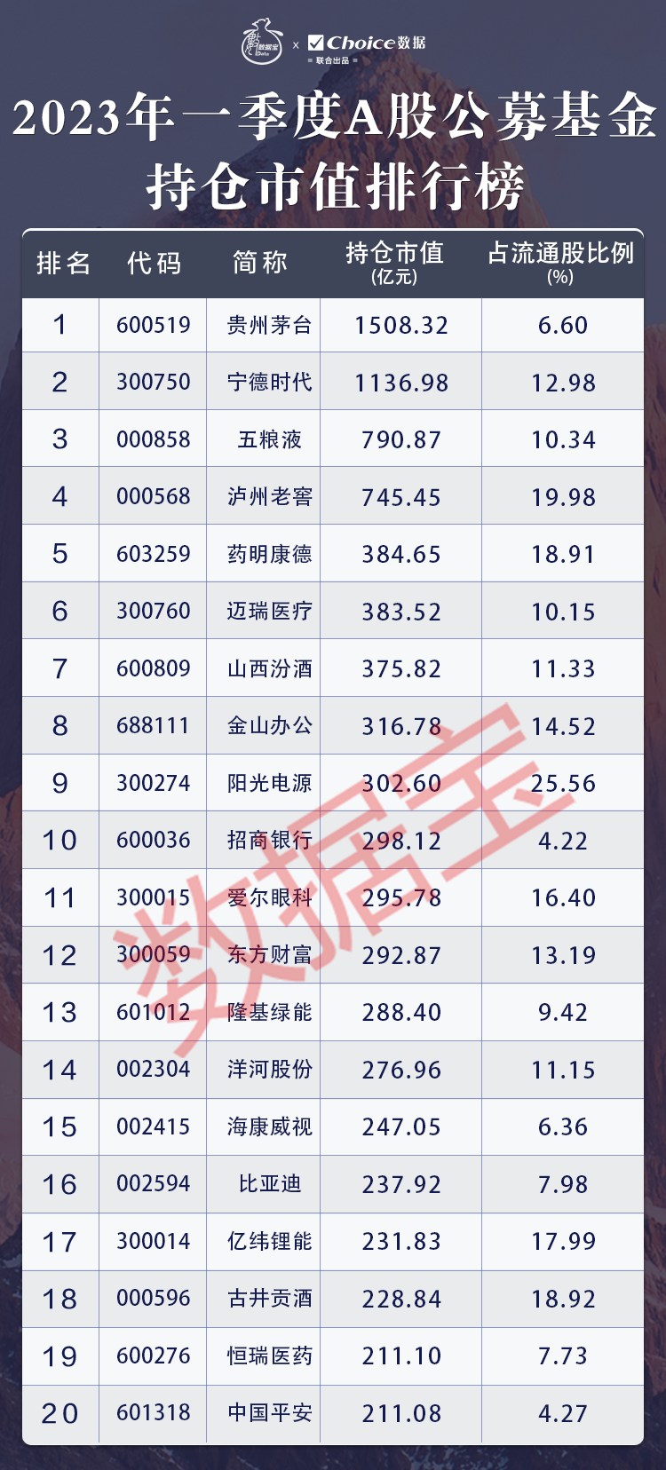 数据宝发布《2023年一季度A股公募基金持仓市值排行榜》。在排行榜前50中,七成上市公司来自电子、食品饮料、电力设备、计算机和医药生物板块,这些板块上榜公司数均在5家及以上。“喝酒吃药”等大消费股仍稳居持仓市值前列,排行榜前20几乎均为消费概念。