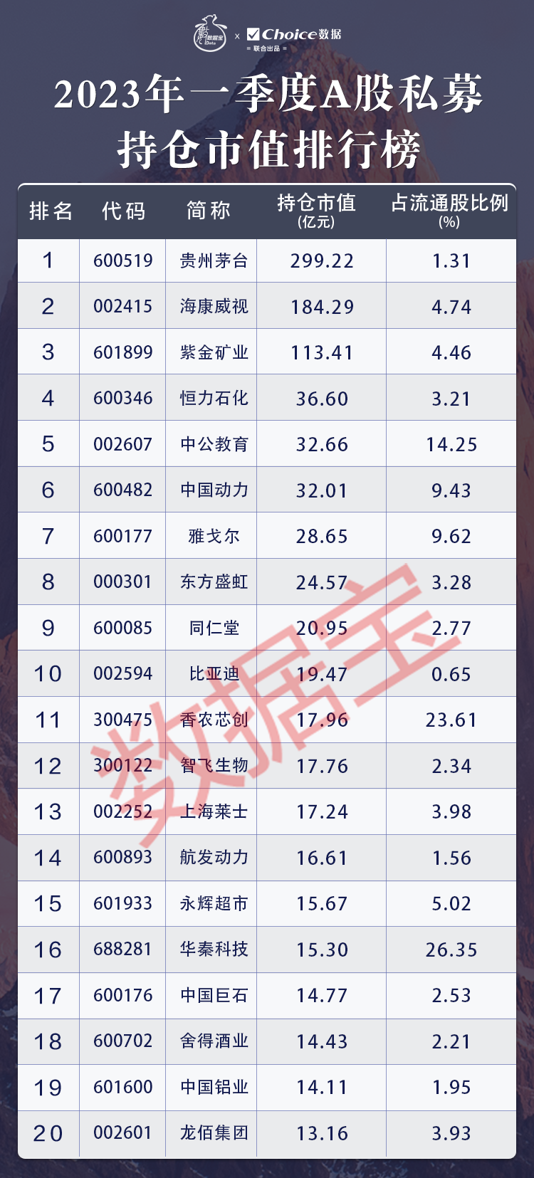 数据宝同时统计了一季度阳光私募持仓情况,发布《2023年一季度A股私募持仓市值排行榜》。私募持仓相对较小,仅对贵州茅台、海康威视和紫金矿业的持仓市值过百亿元,依次为299.22亿元、184.29亿元和113.41亿元。