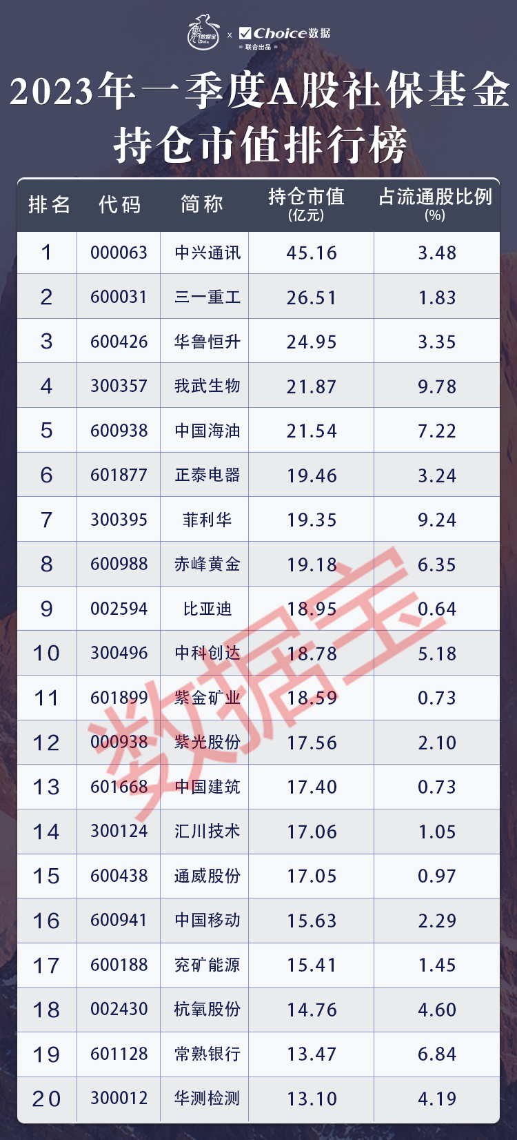 细分至个股,中兴通讯、三一重工、华鲁恒升、我武生物和中国海油排名前五,社保基金持仓市值均逾20亿元。中兴通讯高居榜首,持仓市值45.16亿元。一季度该股累计上涨25.91%,获社保基金111、112组合新进,合计买入7645.86万股。