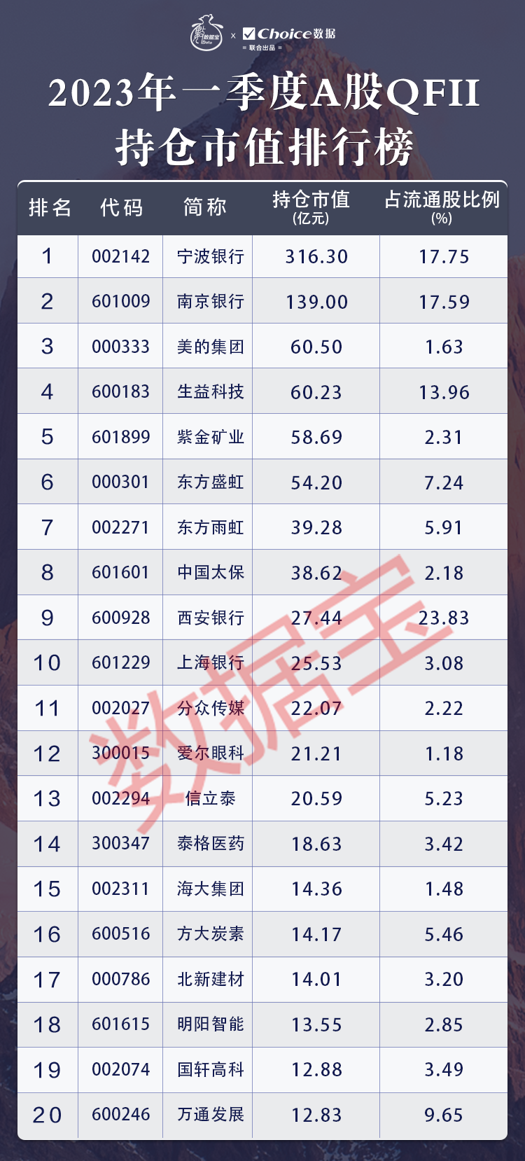 QFII是外资配置A股市场的重要渠道,数据宝发布《2023年一季度A股QFII持仓市值排行榜》显示,排行榜前50中,QFII重点布局电力设备、大金融及医药生物板块,分别有9股、8股、6股上榜。
