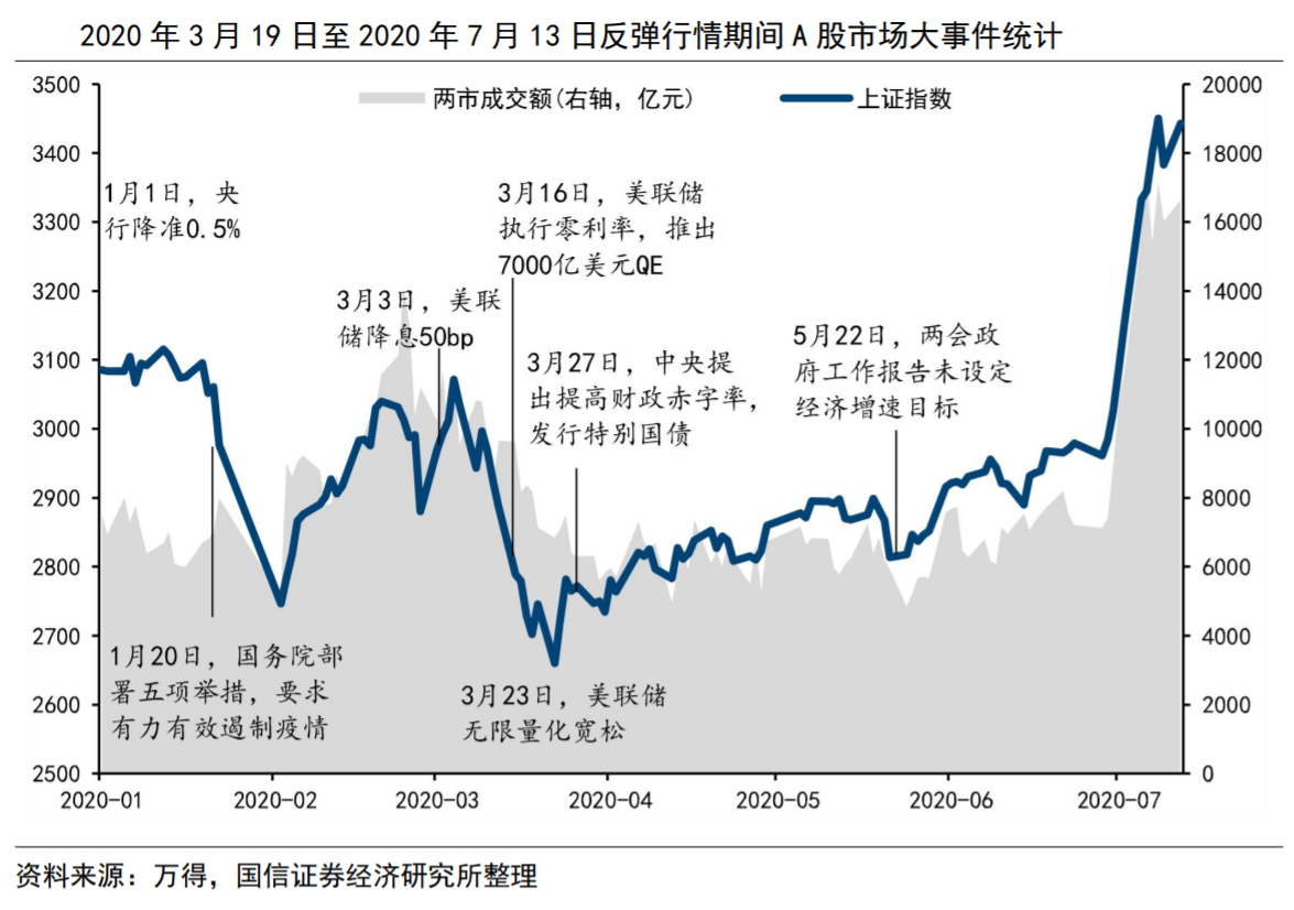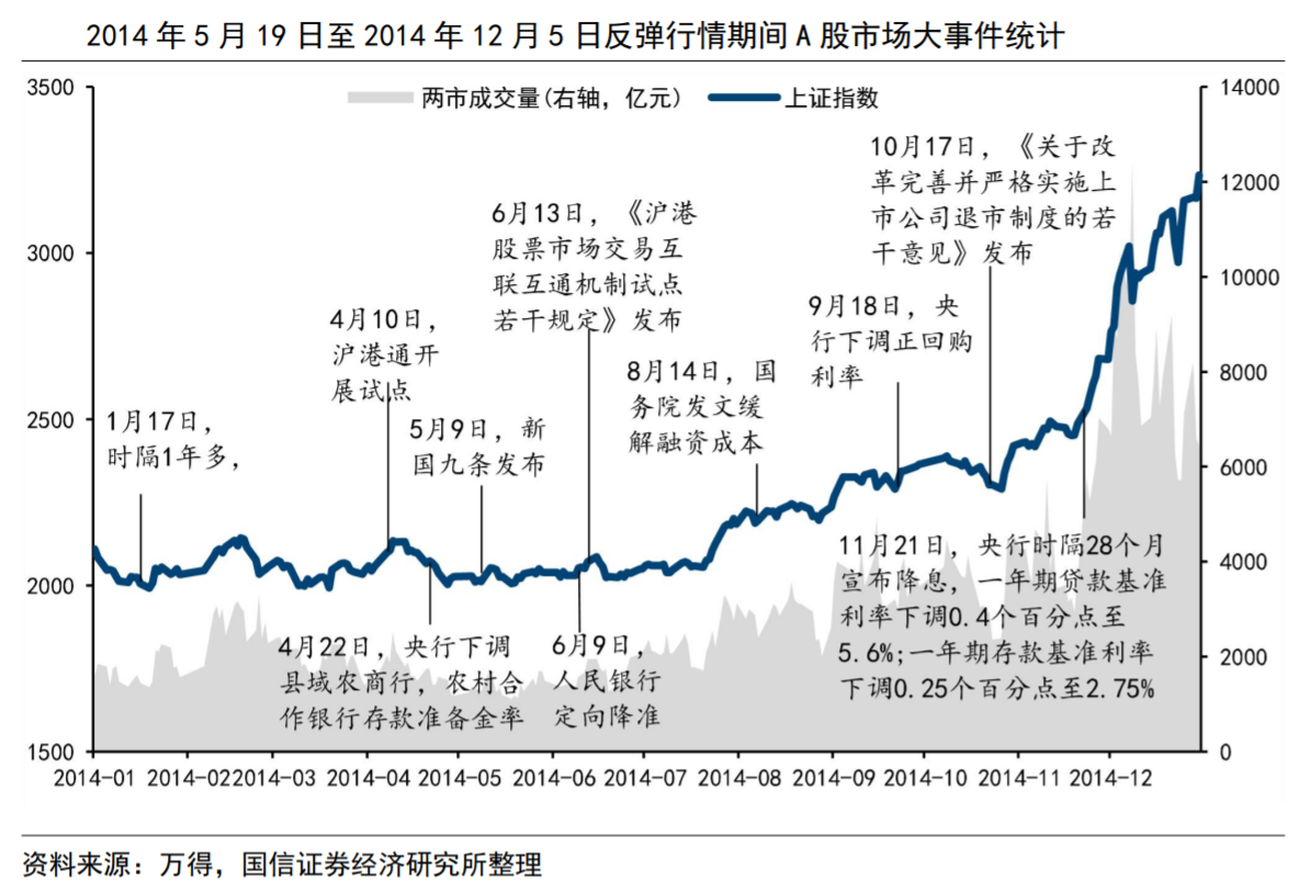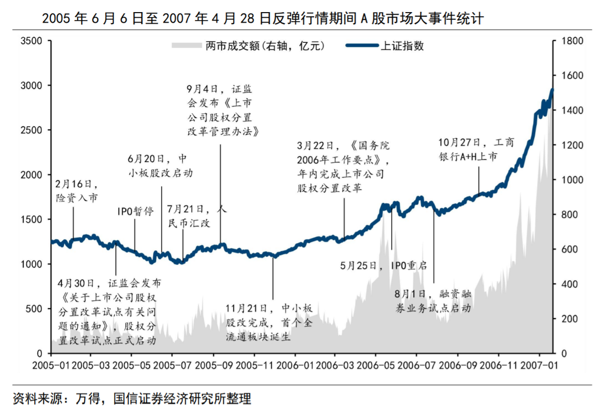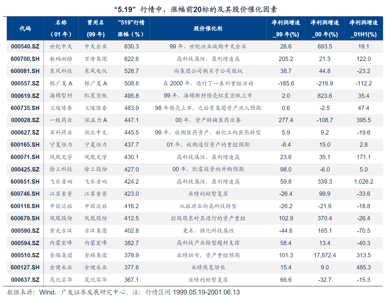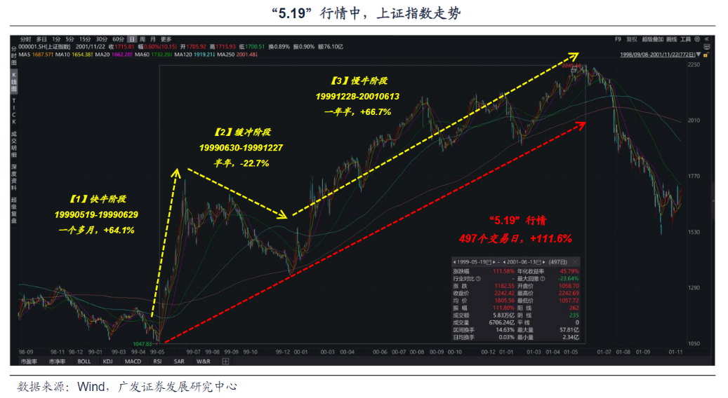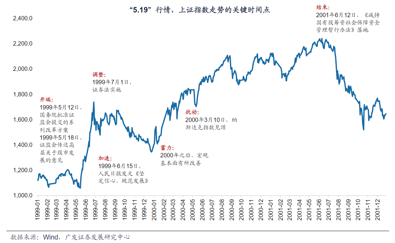 1)行情开端:1999年5月12日,国务院批准证监会提交的改革方案;1999年5月18日,证监会传达高层关于股市发展意见;行情调整:1999年7月1日,证券法实施;行情加速:1999年6月15日,人民日报发文《坚定信心、规范发展》;行情蓄力:2000年之后,宏观有所改善;行情结束:2001年6月13日,国有股减持规定落地。
