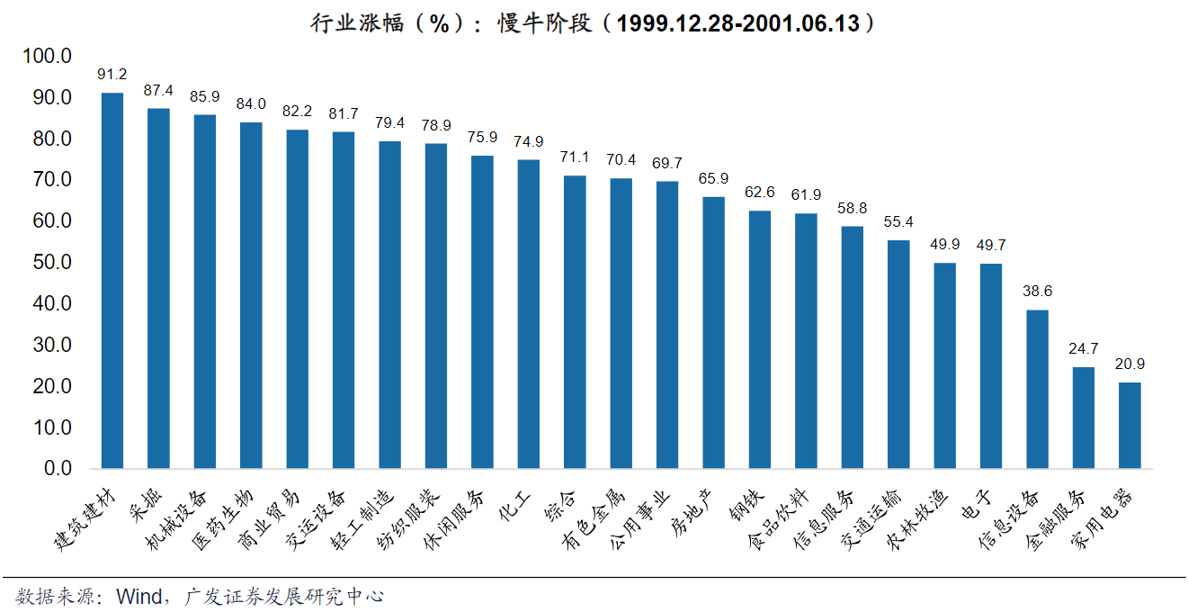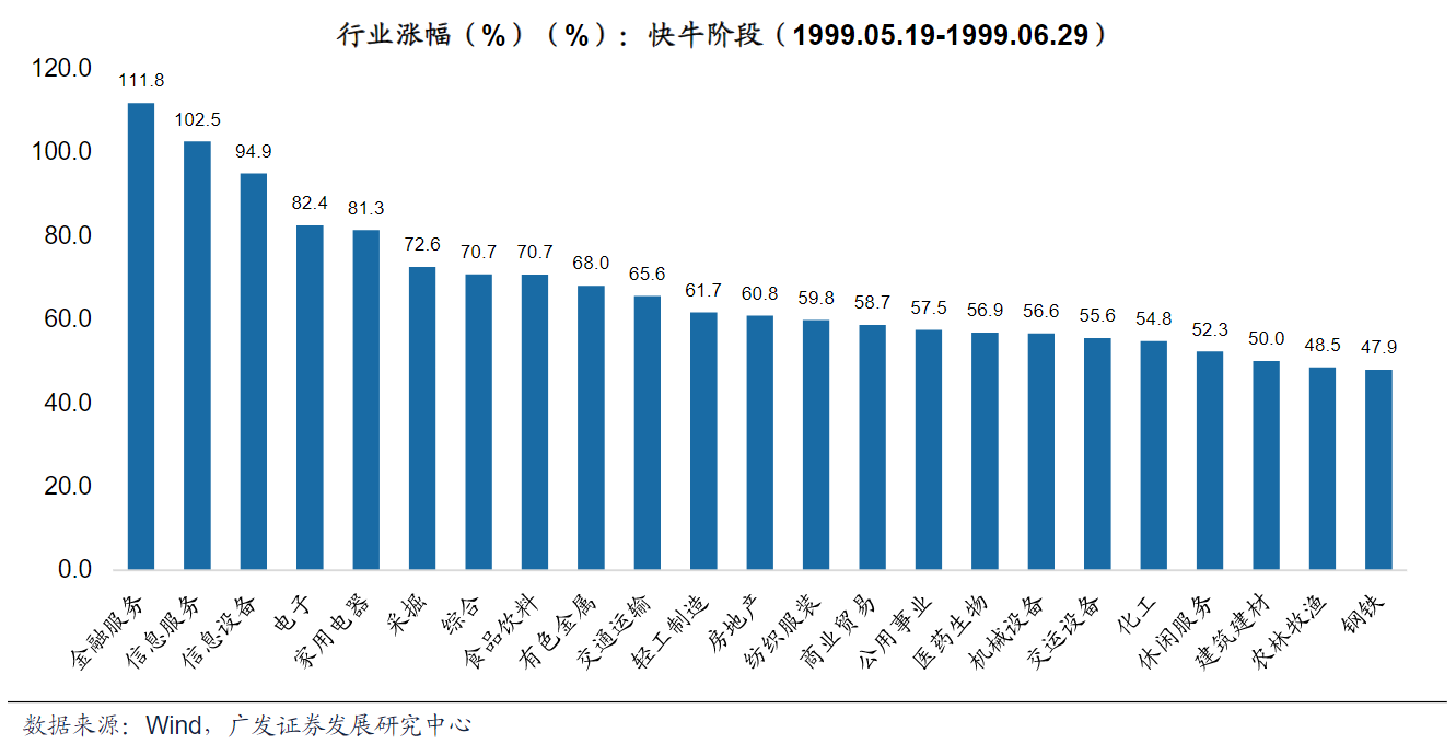 (1)快牛阶段(1999.05.19-1999.06.29):涨幅前三行业:金融服务(+111.8%)、信息服务(+102.5%)、信息设备(+94.9%);金融服务与信息行业在牛市初期的弹性最好,此时与基本面的关系不大,反应的是市场情绪因素、流动性因素的变化。