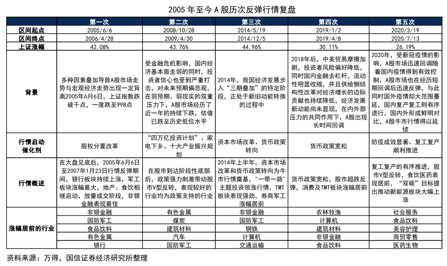 进入2000年后,历次股市回暖行情多经历一波三折,我们应对A股走势保持耐心与谨慎的乐观。2005年至今的五次股市行情,每次都始于A绪极度低迷时期,指数处于低位的窄区间震荡,估值和成交量均位于阶段性底部,正是在这样的背景下,政策面的利好消息都对股市产生较大的弹性,一旦受到外部利好消息的刺激,市场情绪会迅速升温,股市行情也会随之快速回暖。具体而言,历次反弹时首次上涨行情的规律特征如下: