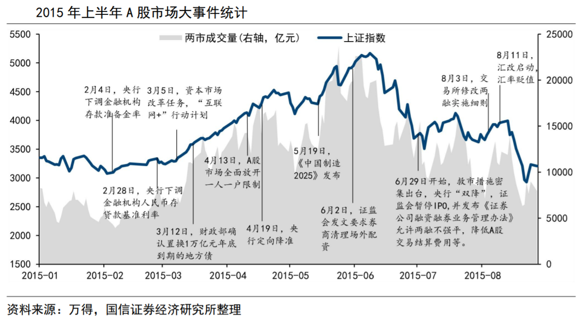 2015年上半年,牛市行情得以延续,市场交投情绪高涨,投资者有较高预期,在杠杆资金的加持之下,股市呈现出量价齐升的繁荣景象,两市成交额在5月份市场热度最高时,一度飙升至两万亿元,上证指数迅速突破5000点,并在6月12日达到最高点位5166点。但是,当时宏观经济并不景气,基本面无法对股市形成有效的支撑,股市与基本面之间出现显著背离,在监管开始清理场外配资之后,杠杆资金迅速出逃,由此酿成两次股灾,2015年全年,股市经历大起大落之后,市场最终回归理性。