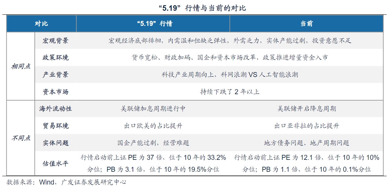 与“5.19”行情相比,本轮行情同样是在宏观经济底部徘徊的环境下,政府采取了一系列刺激和改革举措,包括货币宽松、推动国企改革、鼓励并购重组、加大科技创新等,引燃了市场的投资热情。但本轮行情开启之前,市场调整时间更长、跌幅更大,起点估值更低、短期上涨速度更快。然而,当前面临的国际贸易环境以及社会债务问题,困难程度更甚。