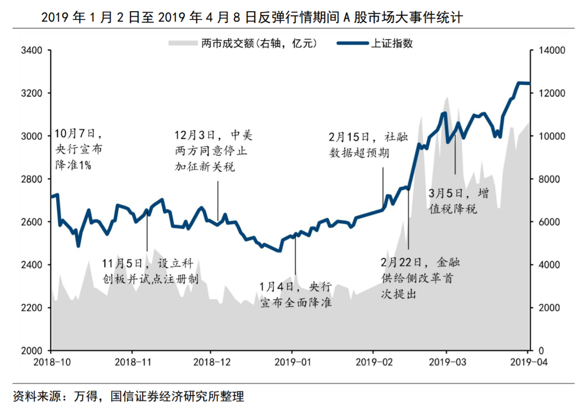 第四轮(2019/1/2—2019/4/8):2018年后,中美贸易摩擦加剧,投资者风险偏好降低,同时国内金融去杠杆,流动性收缩。供给侧结构性改革对经济增长的边际贡献也持续降低,经济发展新动能尚未显现,在内外部压力的共同作用下,A股出现长时间回调。进入2019年,经济基本面企稳,政策底、经济底及市场底得到确认,A股由此开启新一轮牛市行情,货币政策宽松,股市超跌反弹,消费及TMT板块涨幅居前。