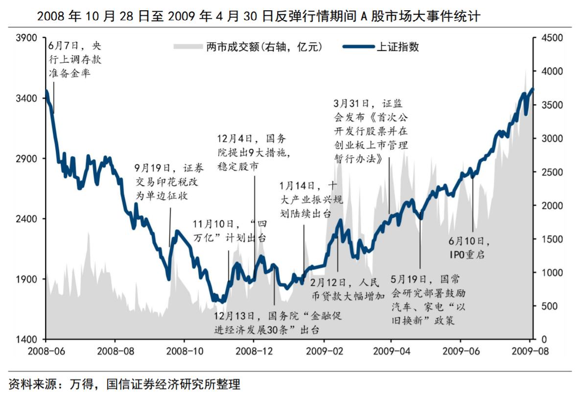 第二轮(2008/10/28—2009/4/30):2008年,国内经济基本面走弱,海外金融危机拖累下投资者对未来基本面前景偏悲观,在弱预期、弱现实的双重压力下,A股市场经历了近一年的持续下跌,估值已跌至历史低位水平。在股市到达阶段性底部后,政策强力刺激带动股市V型反转,表现较好的行业均为有政策利好支持的行业。