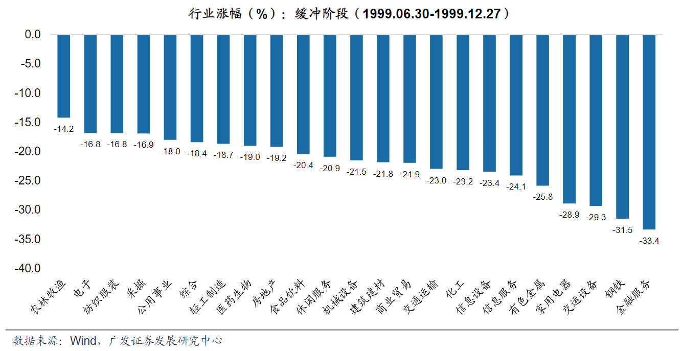 (2)缓冲阶段(1999.06.30-1999.12.27):涨幅前三行业:农林牧渔(-14.2%)、电子(-16.8%)、纺织服装(-16.8%)。缓冲阶段,调整幅度较大的行业主要是前期涨幅较大的比如金融服务,以及业绩压力较大的比如交运设备、家电和钢铁;表现抗跌的主要是前期涨的少的如农林牧渔,或或低贝塔品种如公用事业。