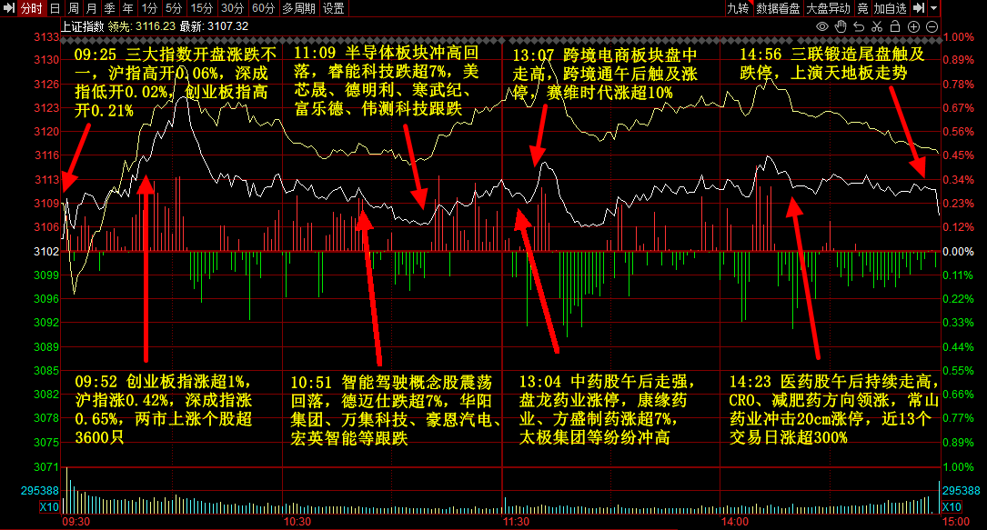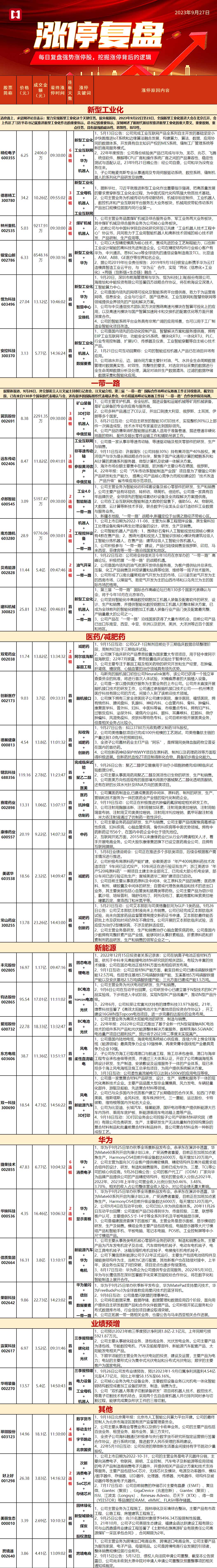 【9月27日】今日周三,大盘全天冲高回落,三大指数均小幅上涨,创业板指领涨。盘面上,医药股全线走强,其中CRO方向领涨,博腾股份涨超10%,药明康德涨超5%;减肥药概念股继续活跃,常山药业20CM涨停,德展健康、双鹭药业涨停。光伏、风电等新能源赛道股展开反弹,宇邦新材、罗博特科涨超10%,钧达股份、东方电缆等涨停。机器人、新型工业化概念股维持强势,德恩精工20CM3连板,精伦电子6连板。