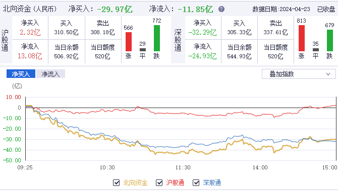 盘面上,教育、人形机器人、Sora概念、地下管网等板块涨幅居前,黄金、煤炭、有色金属、中字头等板块跌幅居前。同时,沪深两市总成交额7754亿,较上个交易日缩量467亿,成交额跌破8000亿。而北上资金,则在今日净卖出29.97亿,再度呈现流出态势。