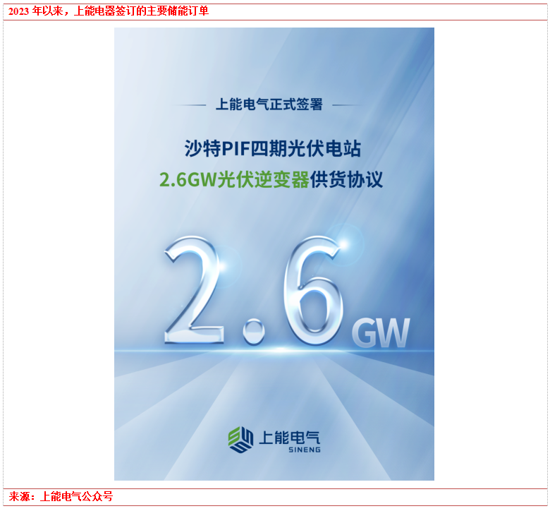 上能电气2023年逆变器出货量达23.47GW,同比增长133%,在中东、欧洲、美国等市场都建立了销售渠道,中东市场业务取得较大增长。近期正式签署由沙特国际电力和水务公司、沙特公共投资基金和沙特阿美电力公司共同投资建设的沙特PIF四期光伏电站2.6GW光伏逆变器供货协议。项目将采用上能电气8.8MW集中式逆变升压一体机,产品拥有更大组网方阵容量,能够快速相应电网调度,无惧当地常年高温、风沙的恶劣环境,出色保障电站发电收益。